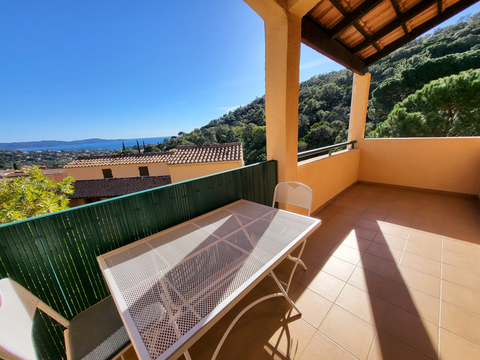 Dans résidence de standing, en dernier étage, 2 - 3 pièces de 43 m² habitable en très bon état, salon donnant sur belle terrasse dinatoire, coin cuisine équipée, chambre, salle d'eau et toilette indépendant, grande mezzanine de 17 m² avec coin nuit + toilette indépendant, très calme, piscine en copropriété, ensoleillé, vue panoramique mer, 2 places de parking extérieur, idéal pour votre résidence secondaire.